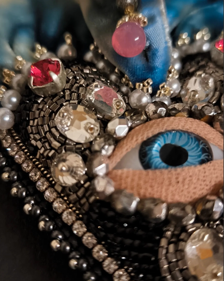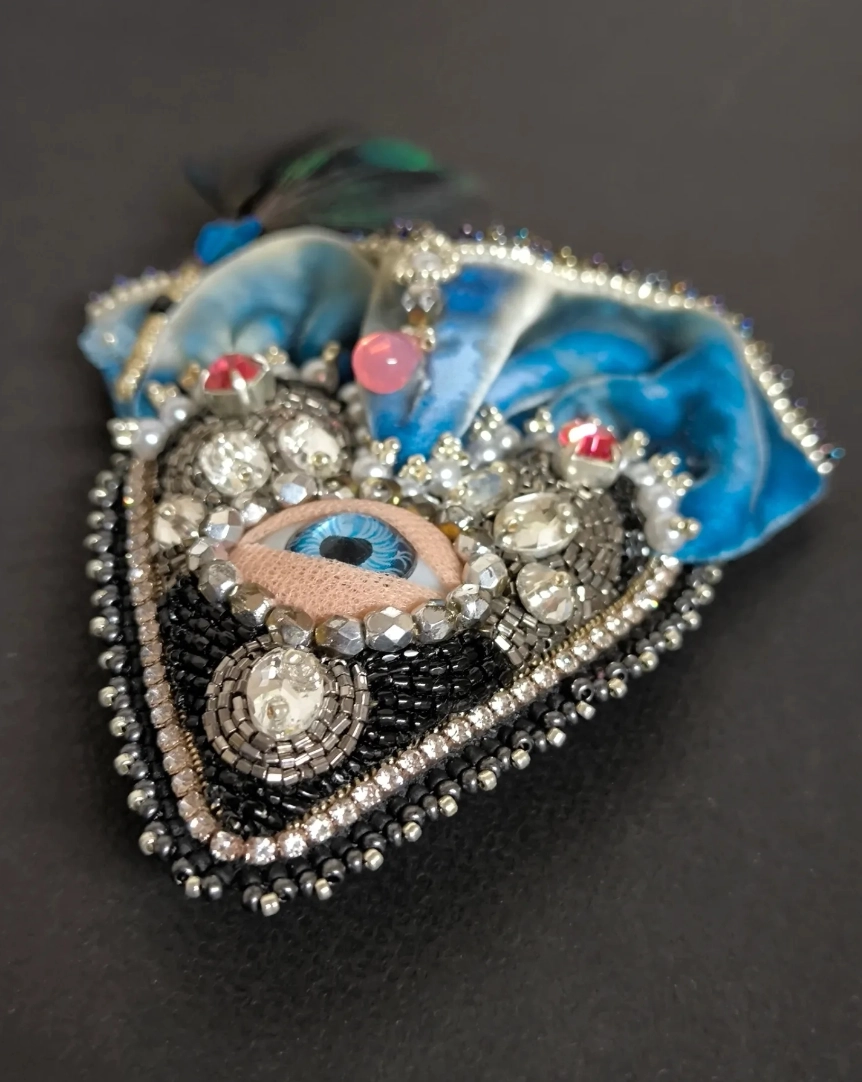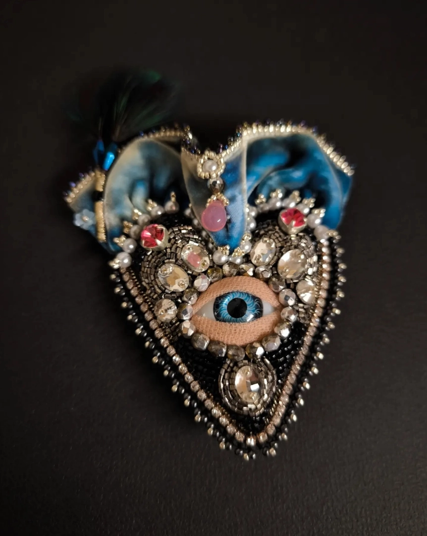 Inspirée des masques de carnaval et de l’esthétique baroque, cette broche dévoile un œil bleu profond entouré de pierres, de perles et de tissus précieux.
