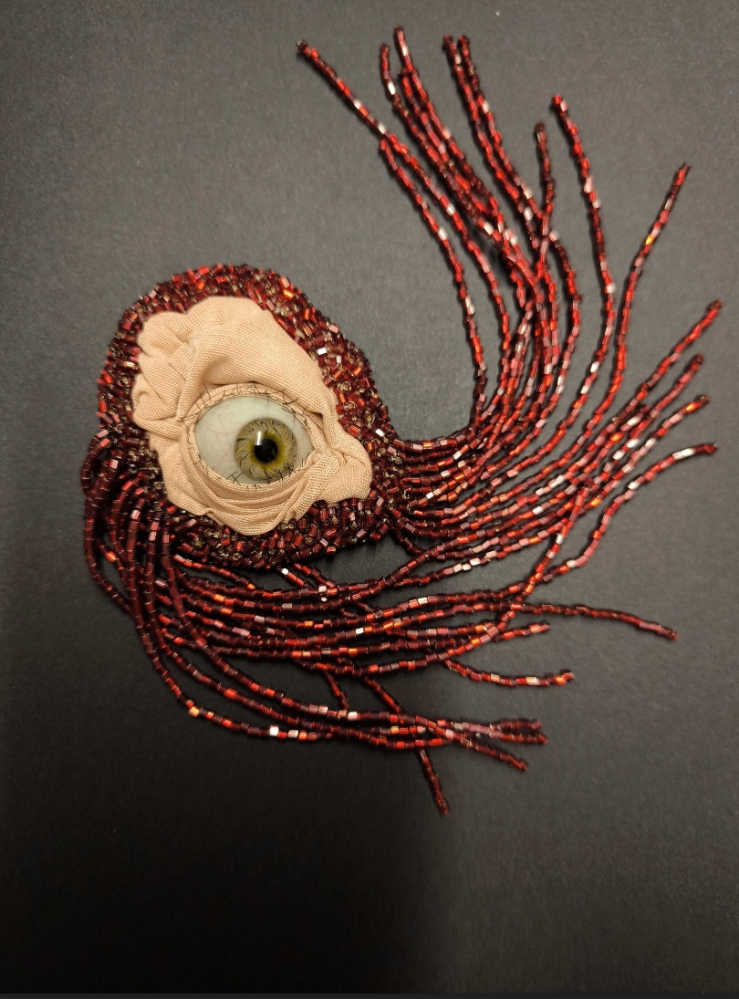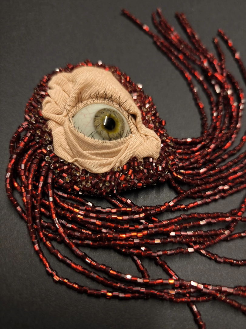 Broche artisanale brodée de perles rouges laissant apparaître un œil mystérieux entouré de franges perlées.