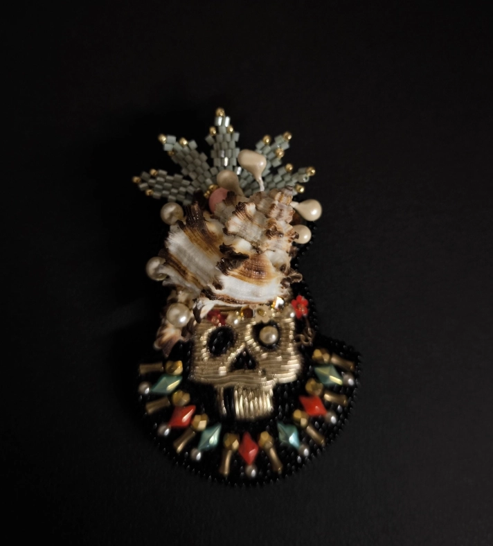 Cette broche originale mêle l’esthétique mystique du crâne à des éléments marins. Un coquillage naturel trône comme une couronne au sommet du crâne, entouré de perles et de broderies délicates.